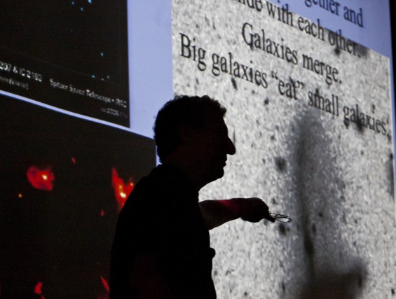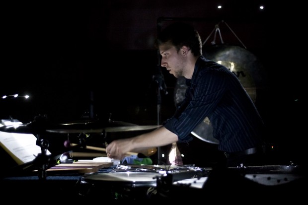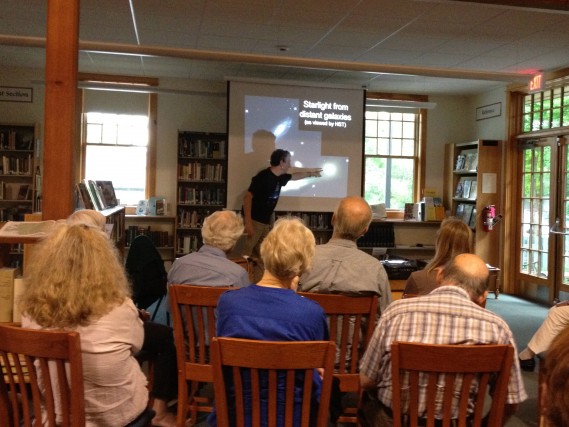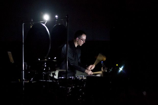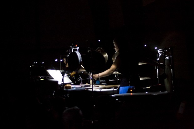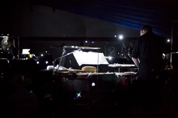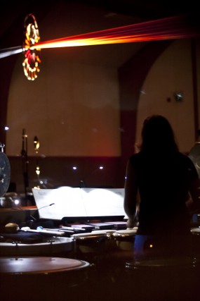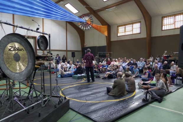 On May 20th, six percussionists (James Beauton, Greg Beyer, Amy Garapic, Doug Perkins, Jeff Stern, and Mari Yoshigawa) and astronomer Tom Geballe arrived in Putney, Vermont for a week devoted to exploring Gérard Grisey's Le Noir de l'Etoile. For six days the ensemble rehearsed in the Greenwood School gynasium and Tom Geballe gave numerous talks for Greenwood students and faculty, members of the local community, and those who attended the performance on May 25th. While the original plan called for a starlit performance on the Greenwood School soccer field, questionable weather called for an indoor experience. Over 200 people, from as close as the houses next door and as far as Dallas, TX, settled onto mats and chairs beneath a giant silk pulsar created by Greenwood faculty member Annie Quest, surrounded on all sides by percussionists and the sound of pulsars.