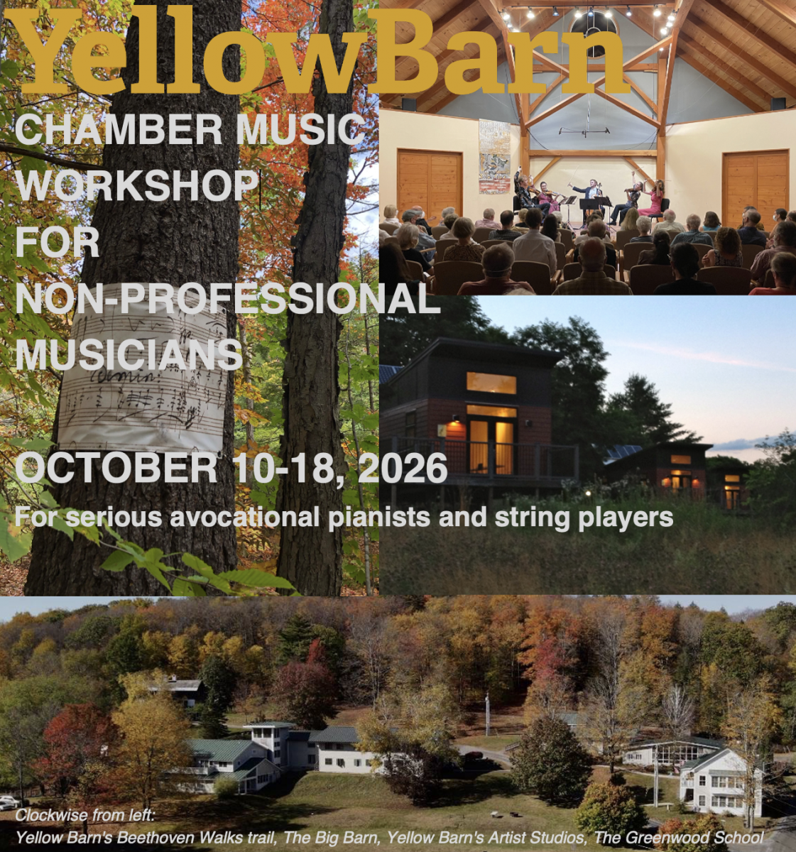 Yellow Barn, an international center for music in Putney, Vermont, embarks on a week-long Workshop for serious avocational musicians in October 2026. The work we do together will use familiar chamber music (rehearsal and coaching) settings as departure points to explore the creative impulse in composer, interpreter, and listener, and their shared potential for connection.